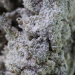 Makrofotografi af Funky Flower CBD-topskud med synlige trichomer og fine grønne nuancer. Strukturen fremstår tæt og krystalliseret med lette orange pistiller og støvede, hvide krystaller.