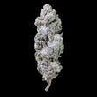 Nærbillede af et enkelt Funky Flower topskud med tydelige grønne farver, frostede trichomer og kompakt, kegleformet opbygning. Sort baggrund fremhæver blomstens detaljer og tekstur.