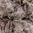 Frostet og tæt struktureret Trainwreck topskud med kegleform og hvid harpiksdækning, mod sort baggrund.